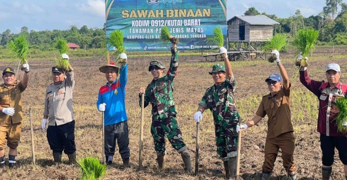 KUTAI BARAT — Kodim 0912 Kutai Barat bersama kelompok tani Geleo Baru melaksanakan penanaman padi jenis Mayas di lahan sawah binaan seluas 100 hektare. Kegiatan berlangsung di Kampung Geleo Baru, Kecamatan Barong Tongkok, Kutai Barat, Senin (29/9/2025) pukul 08.00 WITA.