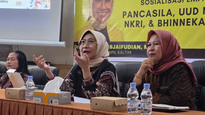 Di depan ruangan, terbentang spanduk kuning bertuliskan ‘Sosialisasi Empat Pilar MPR RI: Pancasila, UUD NRI 1945, NKRI, dan Bhinneka Tunggal Ika, lengkap dengan foto Hetifah.