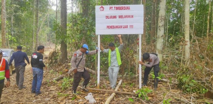KUTAI BARAT – Upaya menjaga kelestarian hutan di Kutai Barat terus dilakukan. Personel Polsek Bentian Besar, Polres Kutai Barat, bersama PT Timberdana memasang papan plang berisi larangan penebangan liar di sejumlah titik wilayah Kecamatan Bentian Besar. Plang berwarna putih dengan tulisan “PT Timberdana, Dilarang Melakukan Penebangan Liar” ini dipasang sebagai bentuk imbauan sekaligus pengingat bagi masyarakat agar tidak merusak lingkungan.